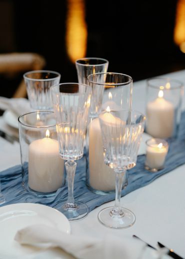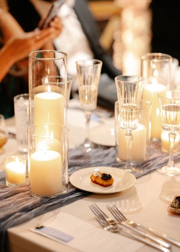 Candle centerpieces at a wedding epitomize romance. Sleek pillars, low votives, textured tapers, and a variety of other innovative options are becoming increasingly popular in wedding centerpieces, offering endless possibilities.